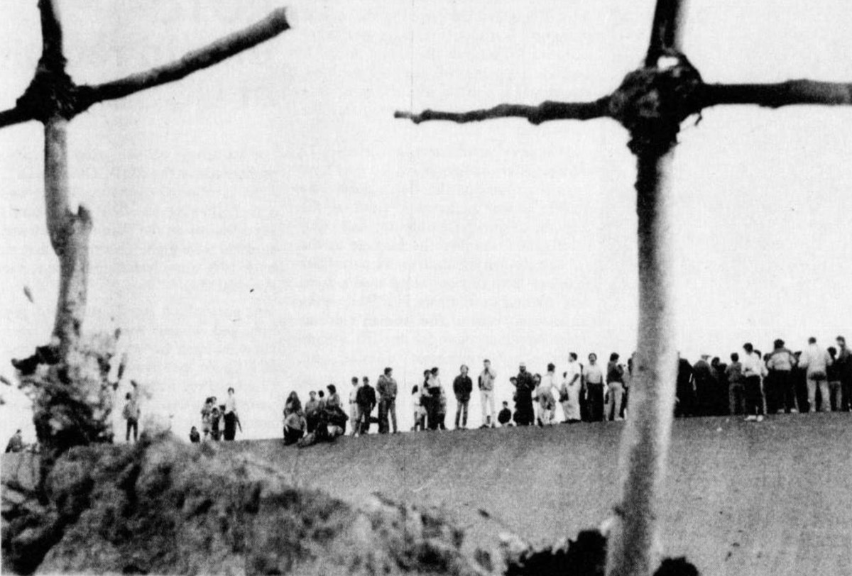 The performance/ counter-demonstration consisted of a line of demonstrators walking parallel to the cars holding up hundreds of cardboard reflectors to bounce back the hateful light. As the car owners turned on their lights, they became invisible, and the artists/ activists held up the reflectors like shields against the glare. The performance was framed by dogs owned by skinheads and police as well as other floodlights used by the law enforcement patrols. The whole thing became a highly violent and reactive set of relations, a long and moving line of reflections and refractions. Through this spatial intervention, the undifferentiated, natural landscape became a site of crisis and contestation of that crisis. Performance can serve as an arena for representing ideological conflict mimetically, but it is also a “real” space in which conflict can be fought out to achieve real consequences.