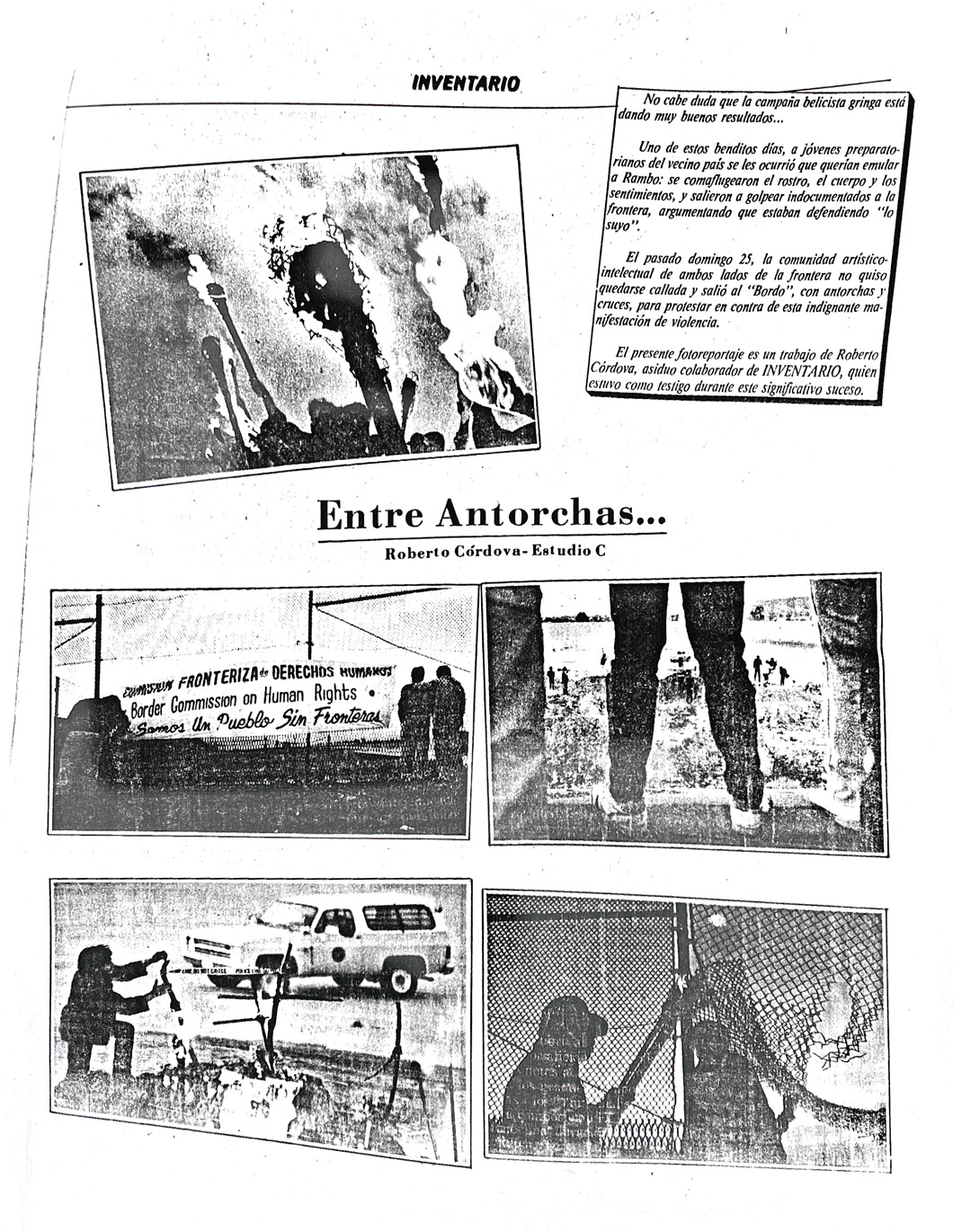 “A propósito de muros, zanjas y fronteras” de/ by María Eraña, publicado en el suplemento/ published in the supplement Inventario del diario/ of the newspaper ABC de/ of Tijuana, April 01 abril, 1990. Imágenes de/ Images by Roberto Córdova Leyva. Archivo María Eraña Archive.
