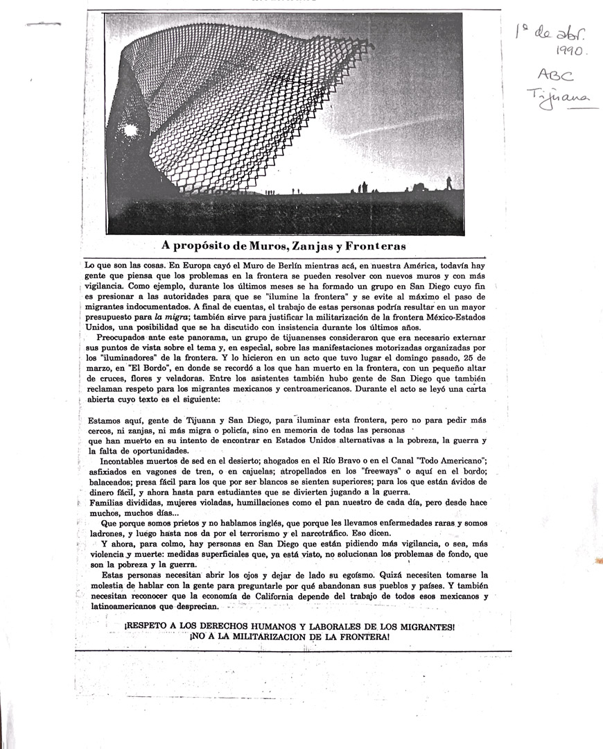 “A propósito de muros, zanjas y fronteras” de/ by María Eraña, publicado en el suplemento/ published in the supplement Inventario del diario/ of the newspaper ABC de/ of Tijuana, April 01 abril, 1990. Archivo María Eraña Archive.