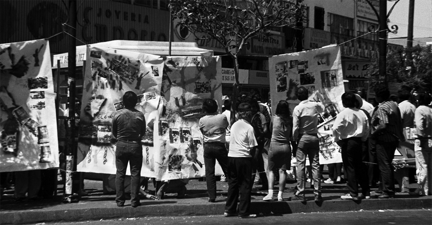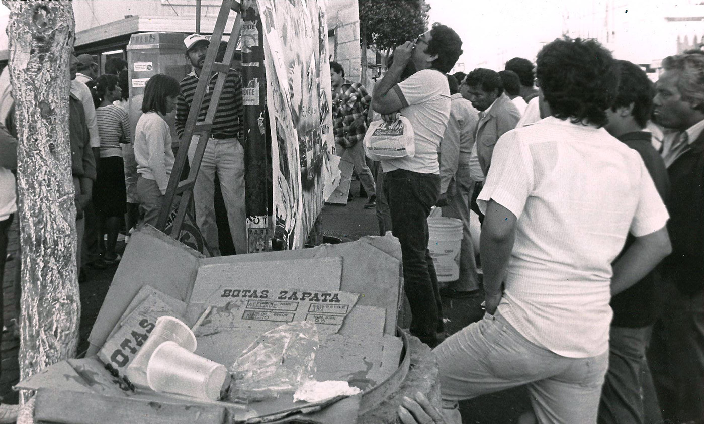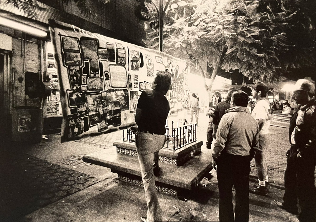 This event commemorated the massacre of students by the Mexican government on October 2, 1968. The artists built what they called “portable murals” or “ephemeral murals,” which were a kind of mural newspaper composed of photographs, texts, and graphics that recounted the event being commemorated. These murals were placed in the public space of Plaza Santa Cecilia so that passersby could stop and learn about “the Night of Tlatelolco.”