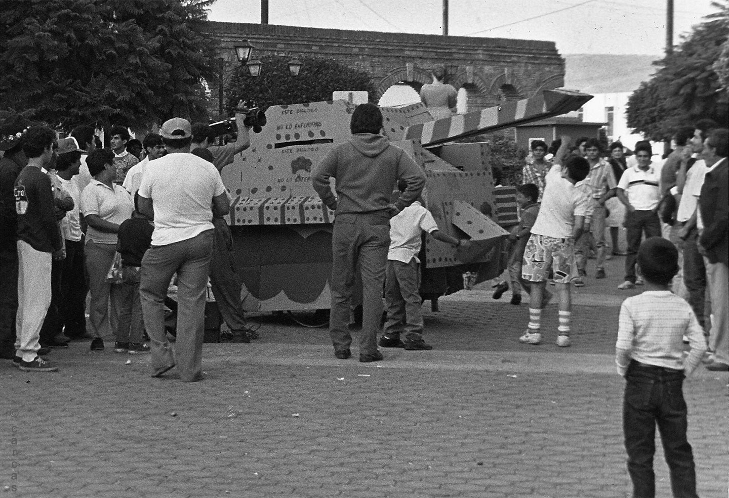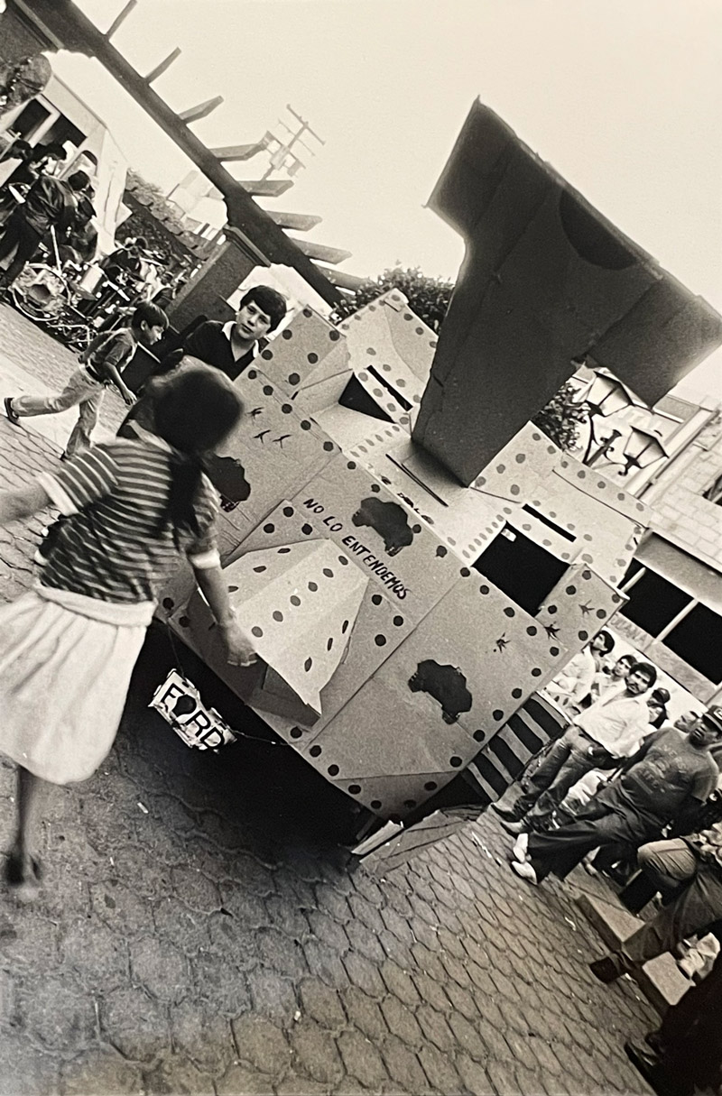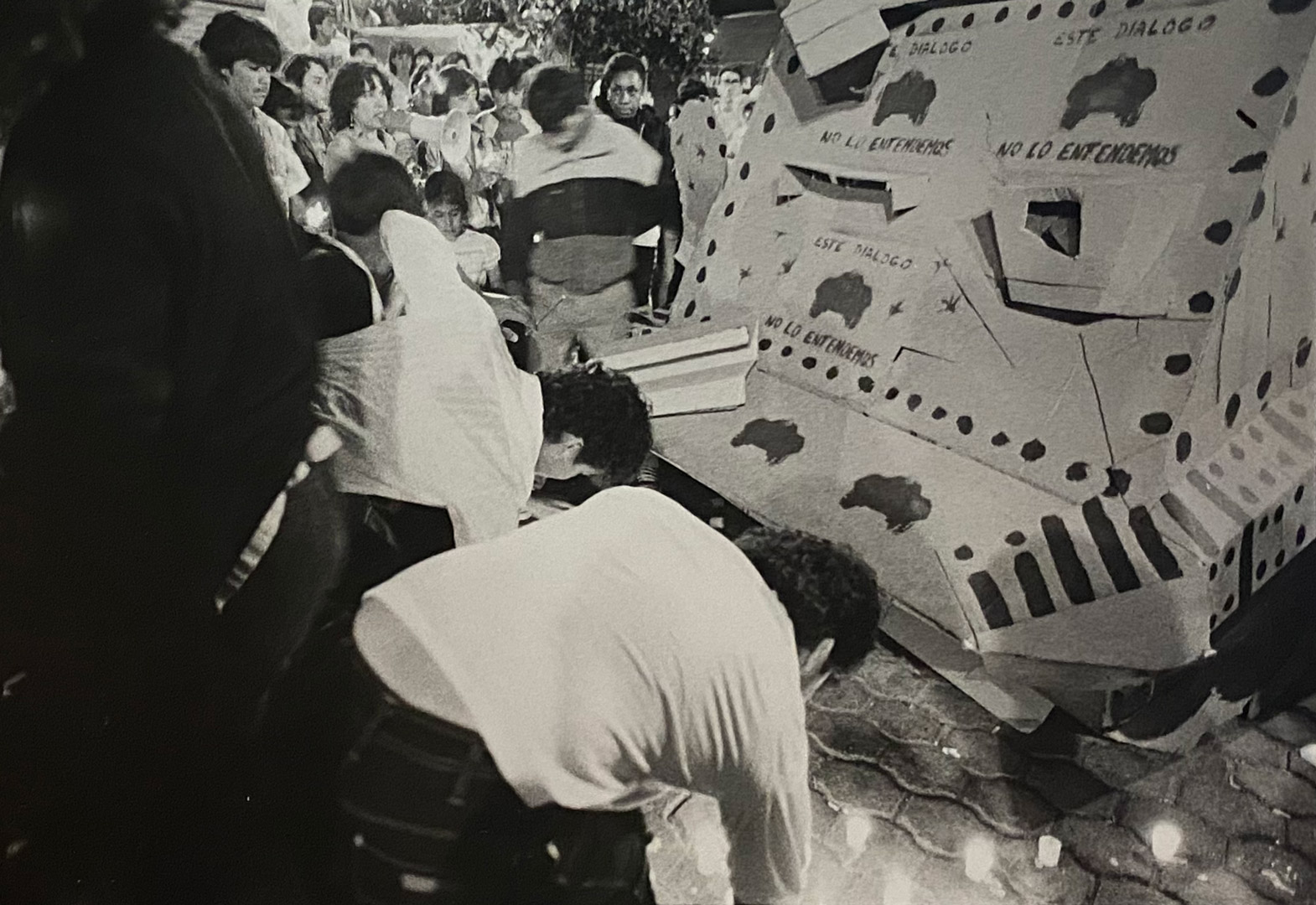 Gerardo Navarro built a cardboard war tank for the occasion. The cardboard was mounted on a mobile structure, like a “carrito de elotes,” where Navarro stood with a Ghetto Blaster recorder—a portable music cassette player—that played the sounds of bullets and bombs. At first, the tank stood still in the center of the plaza, and the children were fascinated. As darkness fell, candles were distributed to the public, and a kind of vigil for the dead of October 2 was held, with the cardboard tank surrounded by lighted candles. From one moment to the next, the tank began to move, surprising children and adults alike. At the culmination of the event, the tank was destroyed on the spot, to the rhythm of live music, as a symbolic act against the military violence of the state.